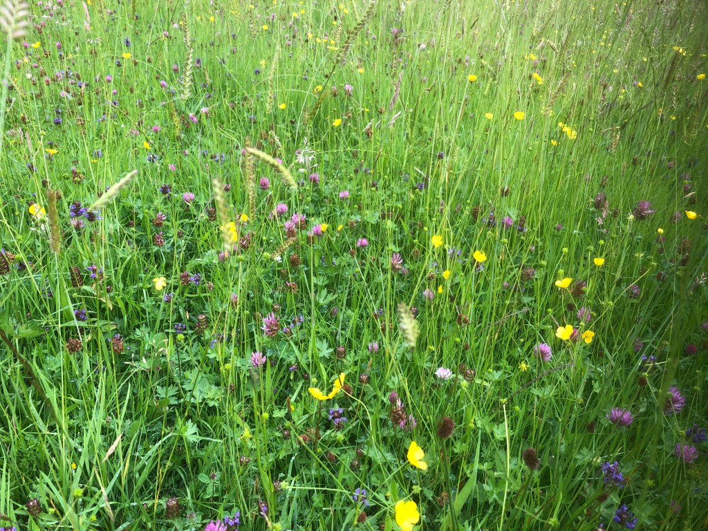 Crossing the road, the path now climbs steeply. A metalled lane winds steeply up through the the forested hillside, for no apparent reason except to demonstrate the stunning views at the top. Walkers will recognise the instruction that says, “Head for a point mid way along the hedge opposite.” Such was the instruction here. No defined path, the hedge opposite invisible behind the incredible summer meadow grasses and flowers before me. Although a beautiful sunny day today it had rained relentlessly in the night so by the time I had finally found the field exit I was soaked from the hips down.