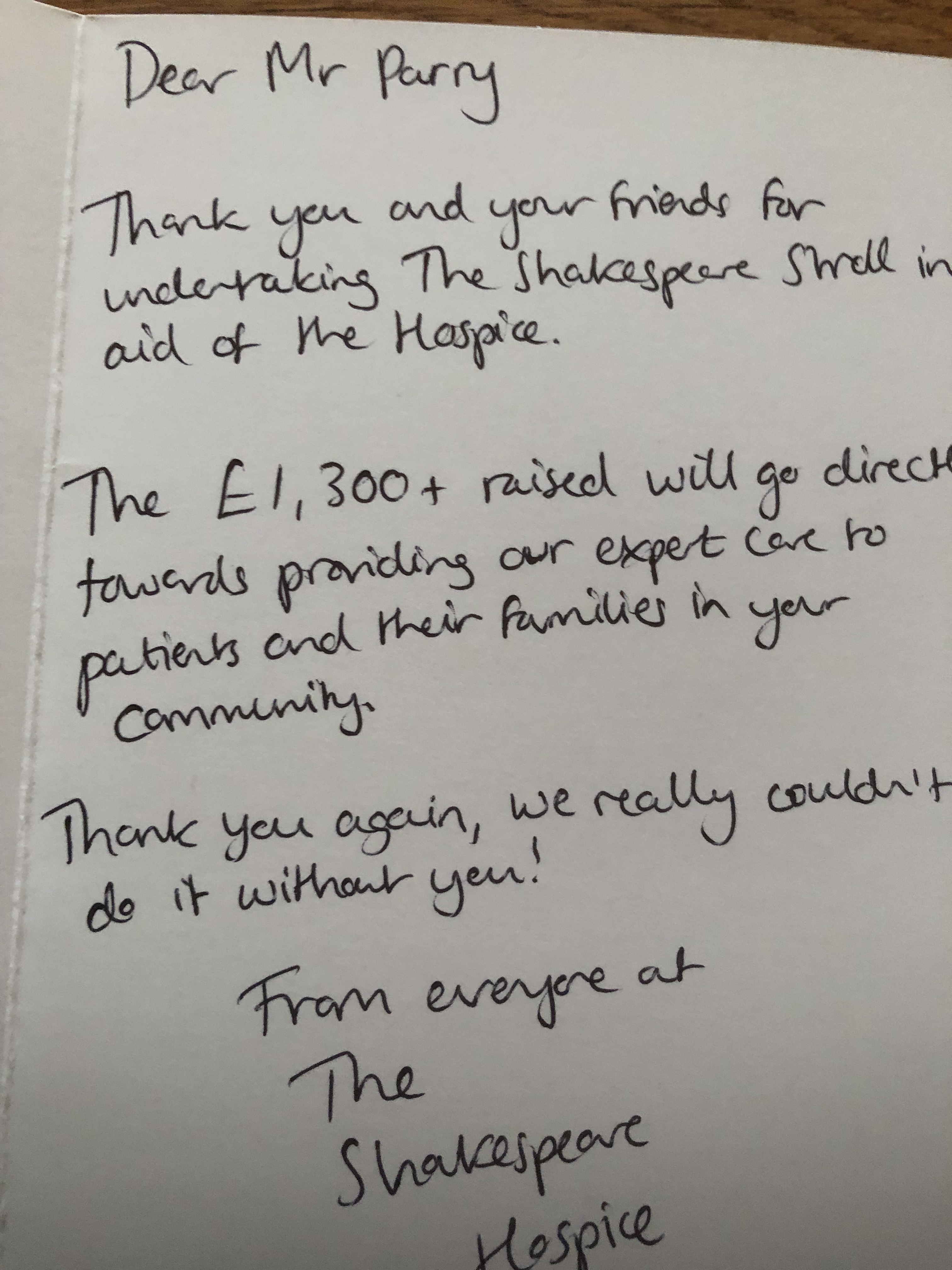 We have just received a lovely “Thank You” letter from The Shakespeare Hospice in Stratford-upon-Avon for the £1300+ we raised on their behalf during our recent Shakespeare Stroll.