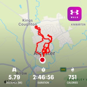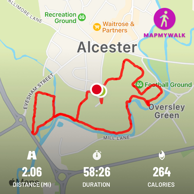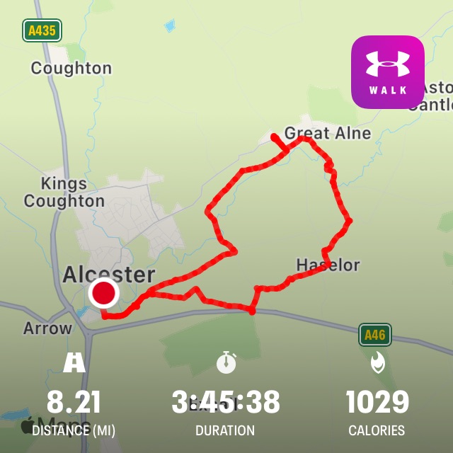 The path finally emerges at the Coughton Round about and I opted to follow the river through Conway fields emerging at Gunnings Bridge and thence back to the start. This was a surprisingly good walk with ample opportunity for walkers to break their journey at The Twisted Boot or The Throckmorton Arms should they so wish. The final walking distance was 6.8 miles so not quite enough for The Shakespeare Stroll but I think I have an excellent alternative idea anyway. Now I’m off to bathe my feet again.