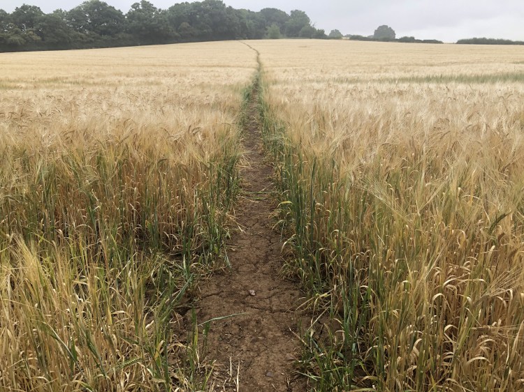 I’m early. No food yet, so I treat myself to a cider and push on. Following the road to Pelham Lane and immediately left at the old level crossing onto the old railway line towards Alcester. Emerging into a golden wheat field I strike right into the next field and follow the path through a glorious field of barley.